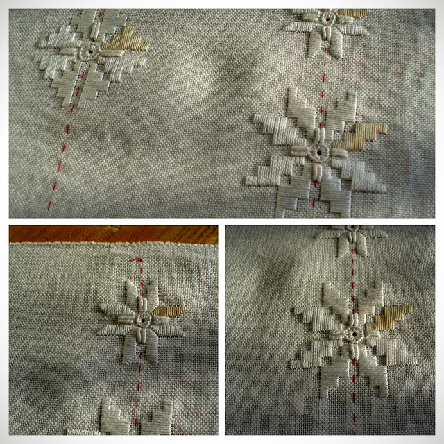 da qui iniziamo a ricamare a fili paralleli, iniziamo con 3 trame, poi 4, poi 5, fino ad arrivare a sette. Quando siete a sette trame fatene altre nove, per un totale di dieci trame in larghezza per sette in altezza. Poi togliete una trama dal basso, fino a ritornare alle nostre 3 iniziali. Più facile a farsi che a dirsi, guardate bene la foto è sara' intuitivo.